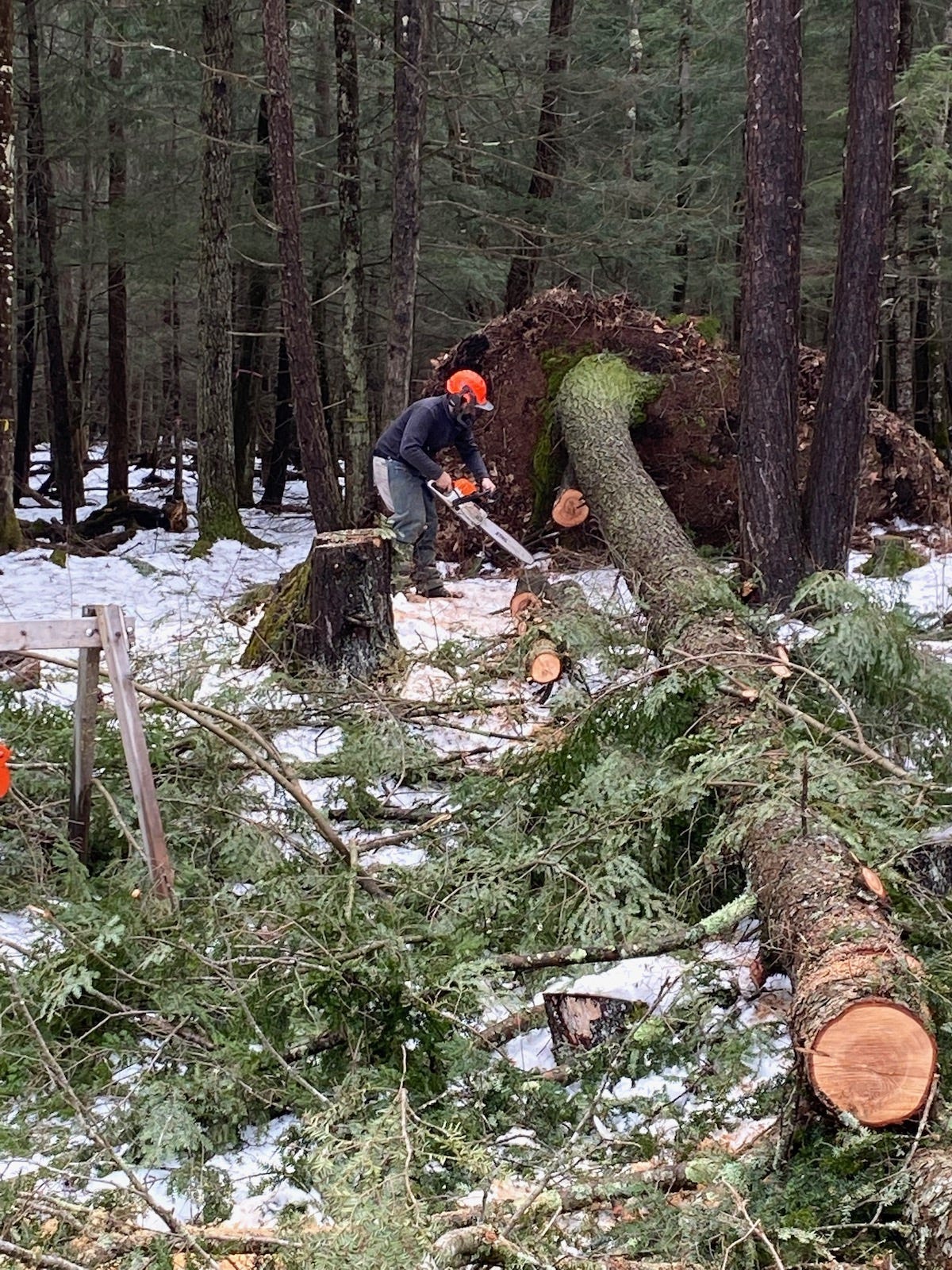 We’ve been running saws and dealing with our woodlot for a solid decade, and I still hate trees like this…but leaving them as they lay is dangerous too. It’s slow and careful work, slicing small limbs first, seeing where the tension lies and where the tree wants to move.