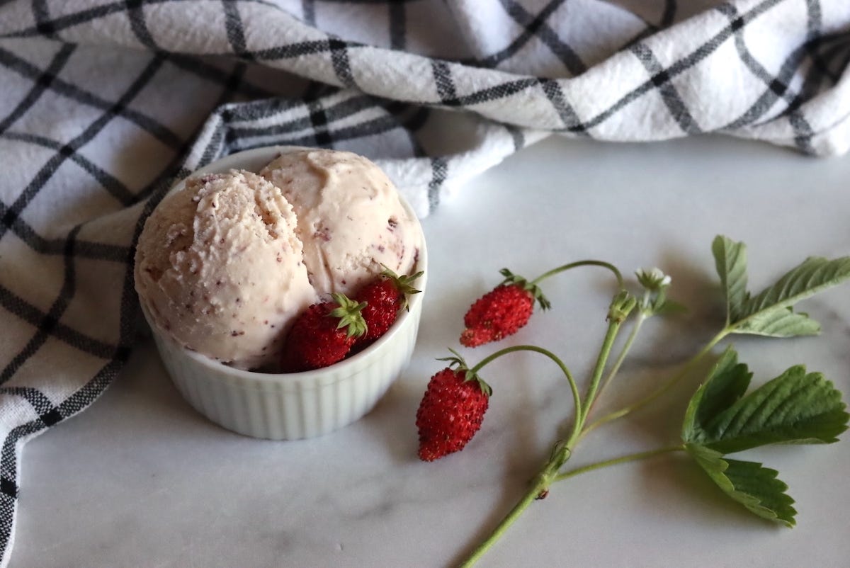 For a batch, you’ll want 2 cups fruit, 1/2 cup sugar, 1 pint heavy cream and 1 cup milk. Macerate the fruit overnight in the sugar, then thrown everything into an ice cream maker until frozen. This recipe also works wonderfully with fresh raspberries. Use more sugar if your fruit are tart or you like your ice cream sweeter, around 3/4 cup.