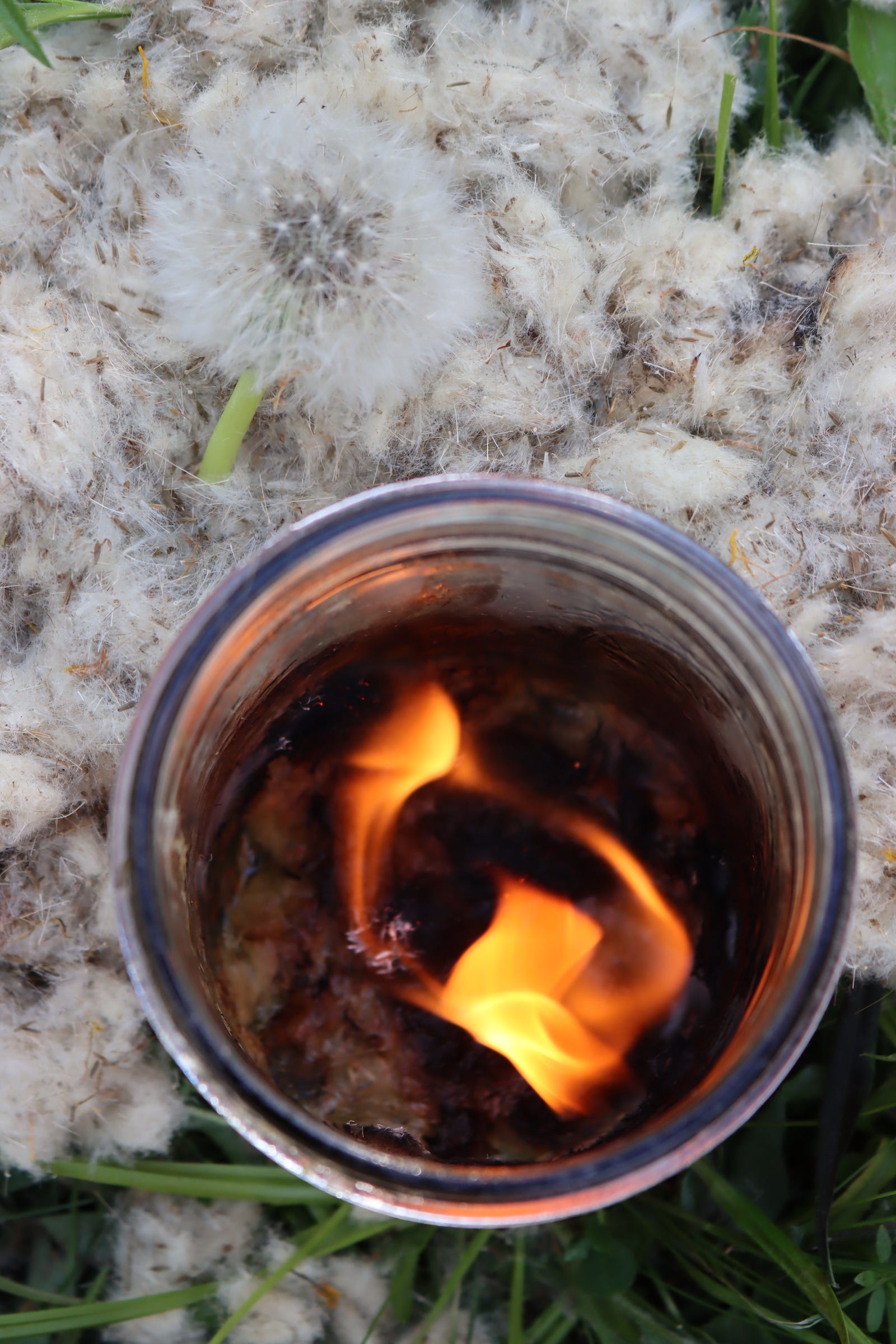 The second way is with fire. Dandelion fluff is incredibly flammable, and it’ll catch a spark and ignite in no time flat.
