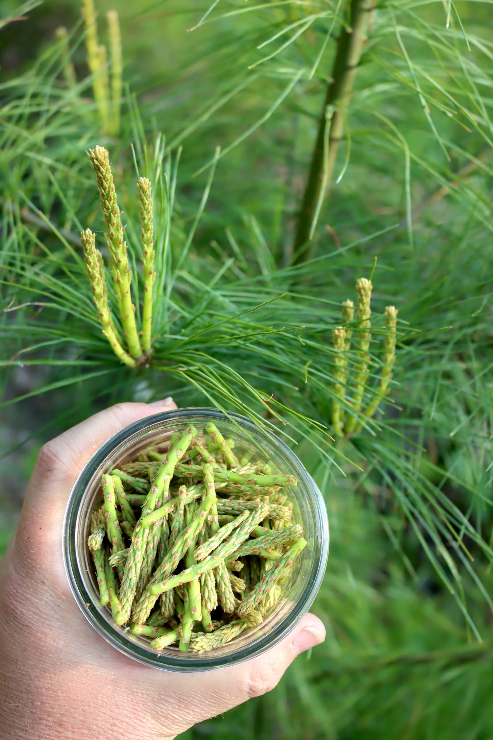 Beyond dandelions, I’m working with Pine Candles, which are the new growing tips on pine trees. They’re basically “spruce tips” but from pine trees.