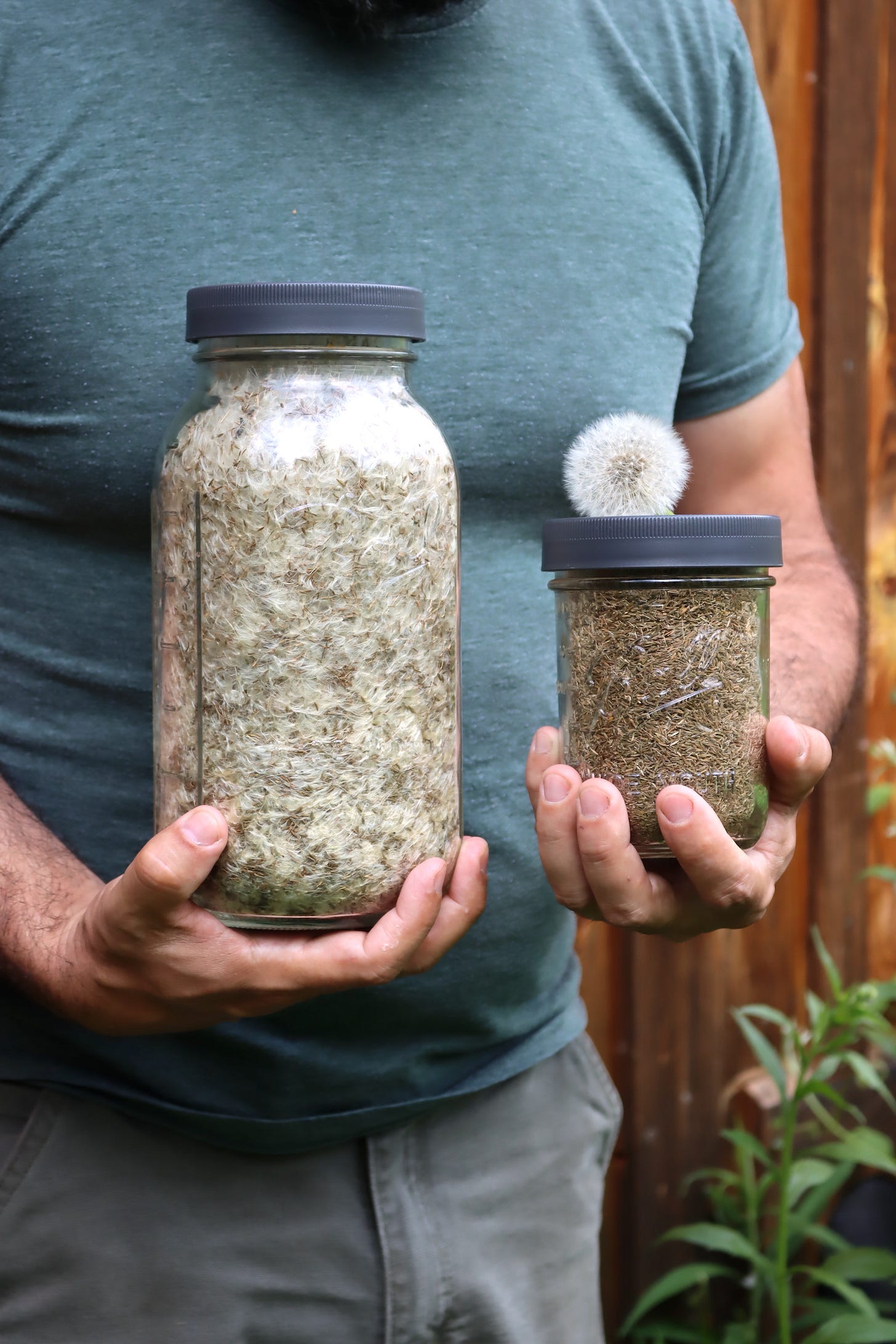 Well, in reality, it took me just about 20 minutes to collect enough fluffy seed heads to yield a pint of cleaned seeds, and then just another 5 minutes to remove the chaff. So for one person, you can easily get a quart (or more) of edible dandelion seeds in under an hour, with easy casual labor, just grabbing up fluffy puff balls on a leisurely walk in the yard.