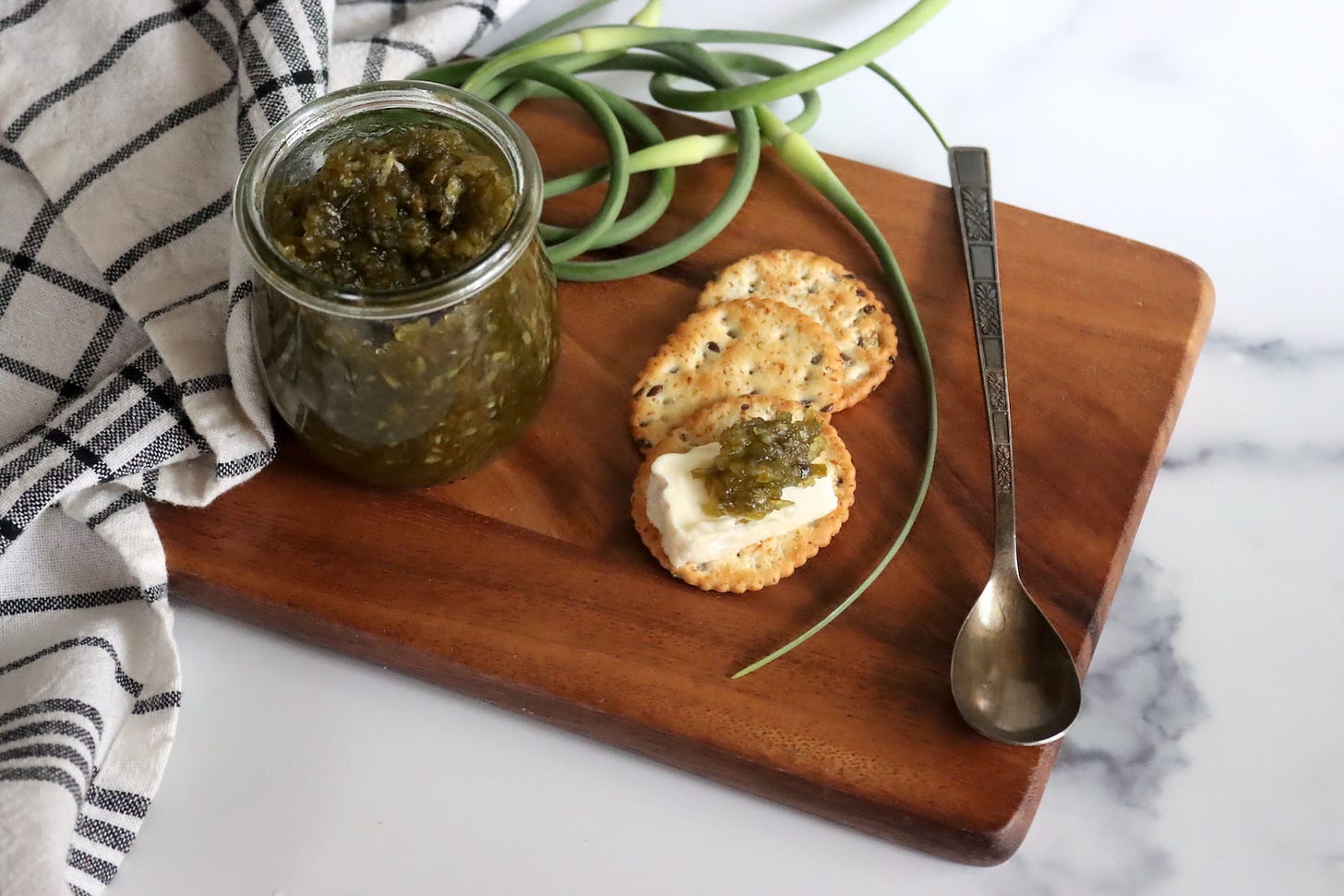 Their recipe had a pretty absurd amount of sugar in it, and I like mine much more savory, with more vinegar and white wine, and around 1/4 their quantity of sugar (but still safe for canning). I’ll have that recipe completely dialed in and posted for you for next garlic scape season.