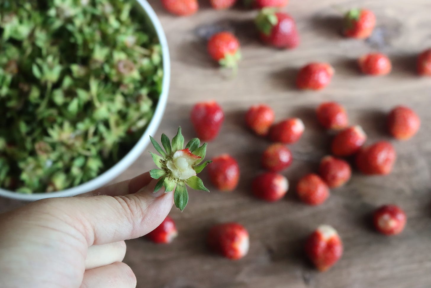 If you’re working with heirloom strawberries, the fruits are very soft and the stems will just pull out, hull and all. You don’t need a knife to cut the top off, and for the most part you just end up with leaves. These are still useful, and make a really tasty tea.