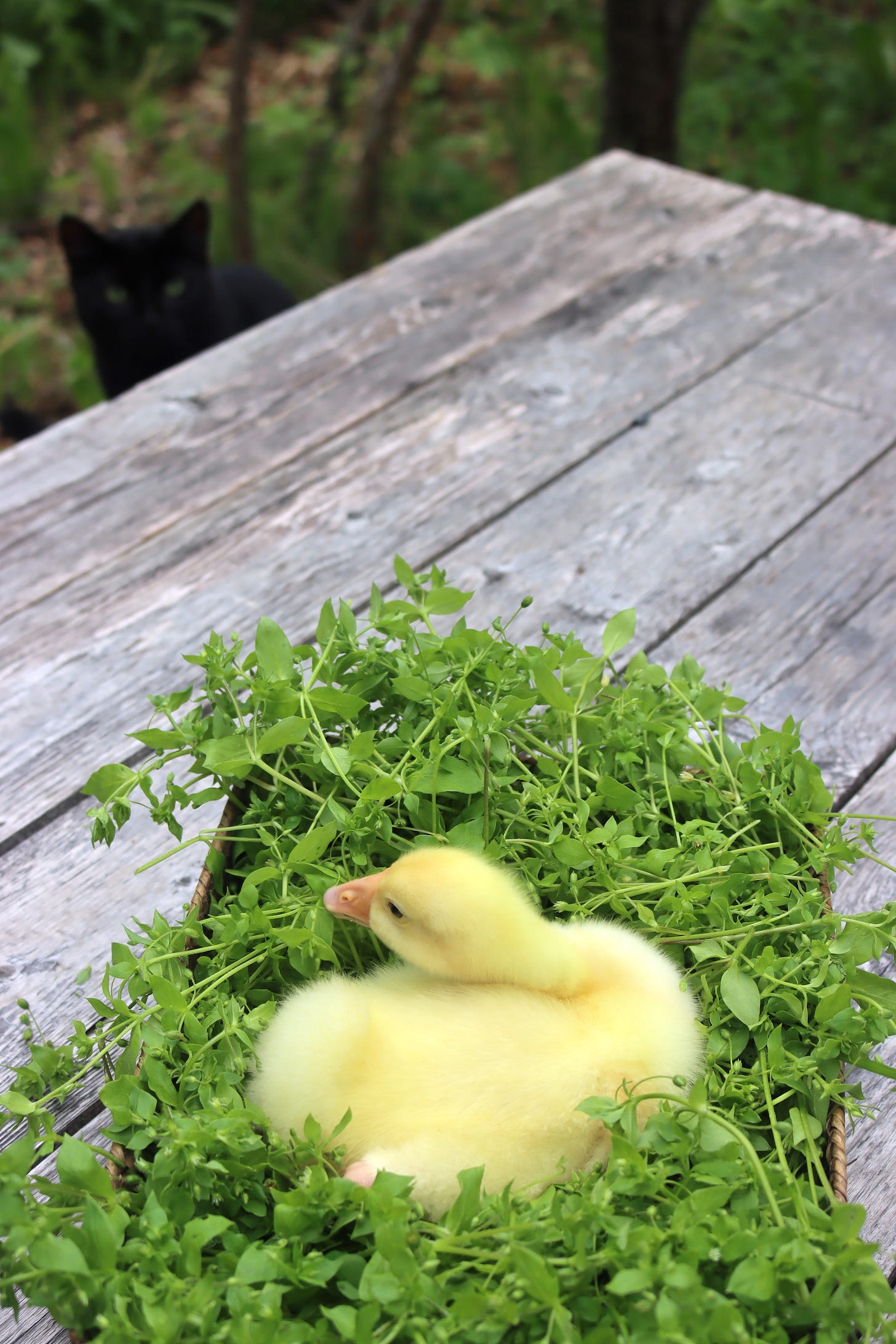 We had a huge flush of chickweed this spring, and we use it for salve, pesto and salad greens…but it just keeps coming. My daughter harvested this basket to share with her baby geese and I thought his little bed of greens was so cute I had to take a picture. Our cat thought had thoughts about the matter as well (top left).