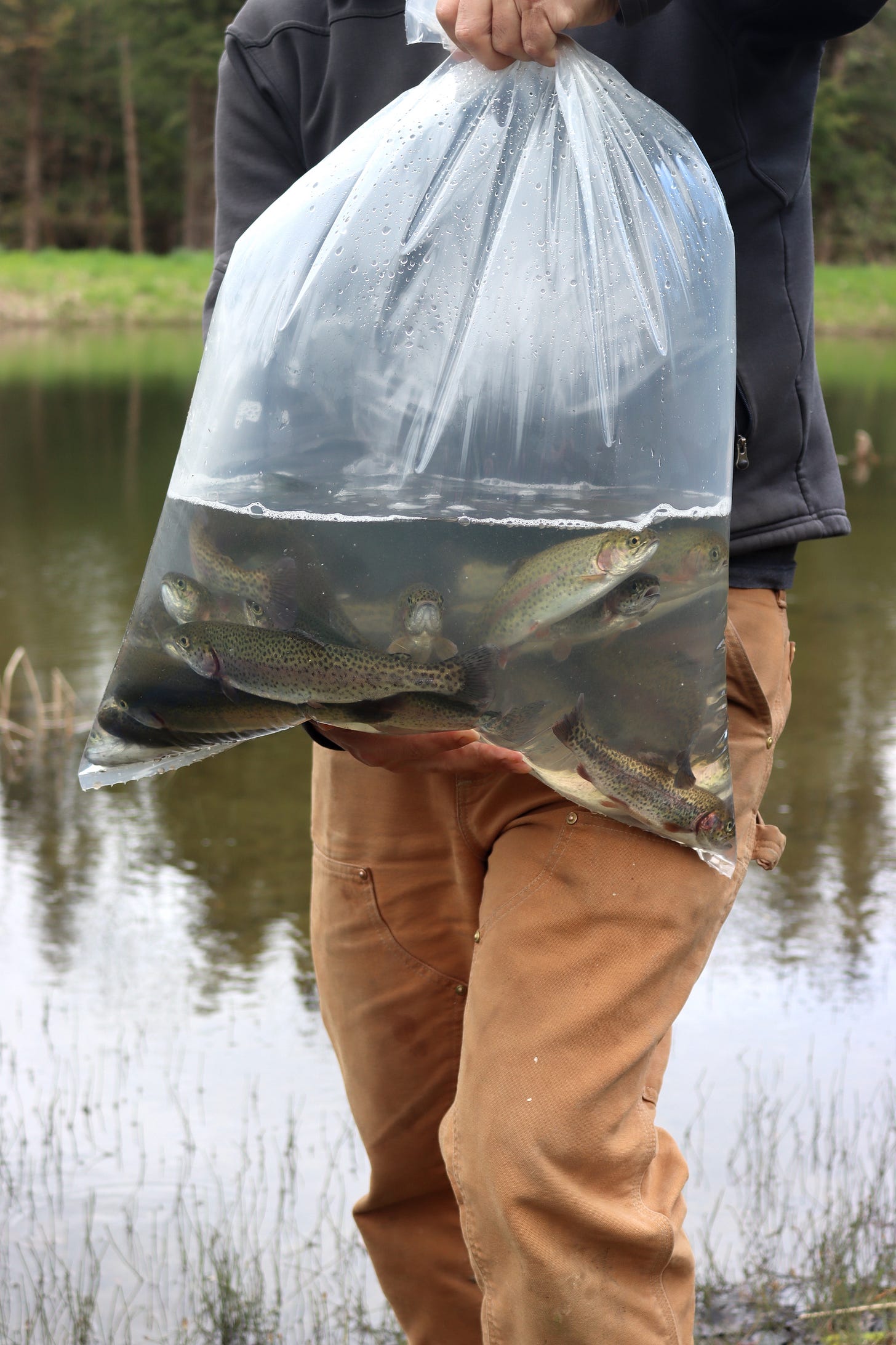 The first Wednesday in May is “Trout Day” at our local feed store where the locals line up and wait for bags from the trout truck to stock their ponds. It’s a wet climate here, and if you’ve got more than a few acres, chances are you’ve got a pond somewhere. These little beauties are surface feeders, and within minutes of release they’re already striking the surface every few seconds turning mosquitos into the rapid growth that will fill our freezer later this summer.
