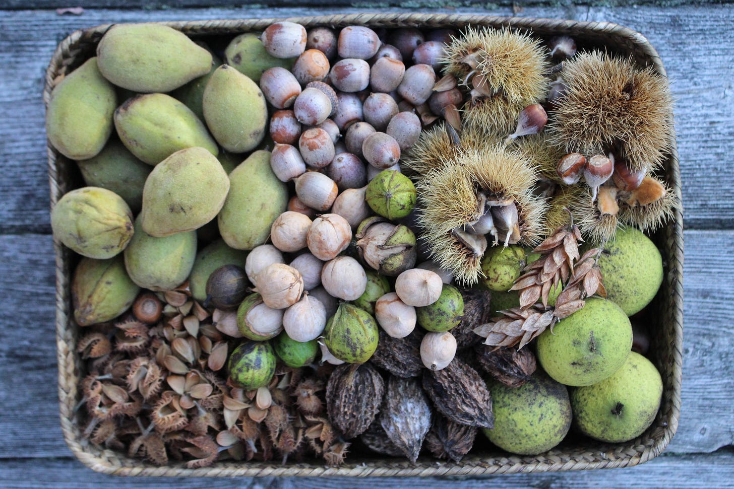 October is one of the best months for foraging. The nut harvest is in full swing with black walnuts, butternuts, chestnuts and hickory nuts. We’re also raking up acorns from oaks by the bucketload to make into acorn flour later this winter (and a few batches of acorn ice cream for the little ones).