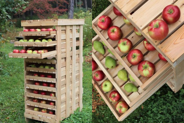 October is peak apple season here, and the varieties come in waves—early ones are already gone, but mid- and late-season heirloom apple varieties are still coming in by the bushel. Most of the late season crop is storage apples, and we have apple varieties that keep 14+ months in our basement in a simple homemade apple storage rack (and no refrigeration).