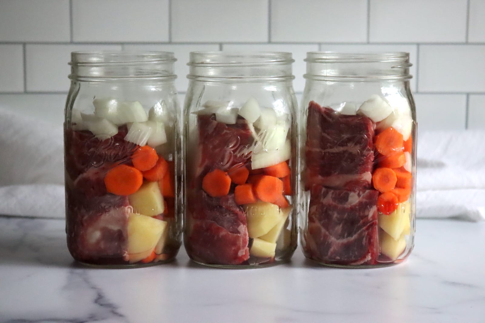 So here, I’ve chosen pot roast in a jar, which is just big hunks of beef chuck with veggies. The nice thing about pressure canning is you can use inexpensive, tough, but flavorful cuts, and they both cook and tenderize during canning.