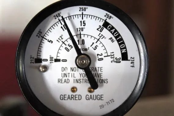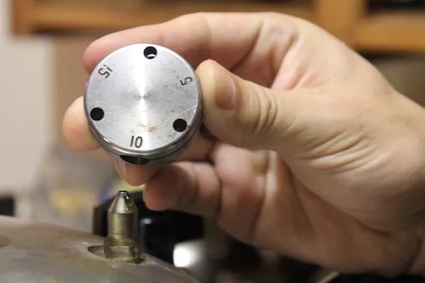 With a weighted gauge, like I use, it’s simple. At or below 1,000 feet in elevation, you use 10 pounds of pressure. Over 1,000 feet, you use 15 pounds.