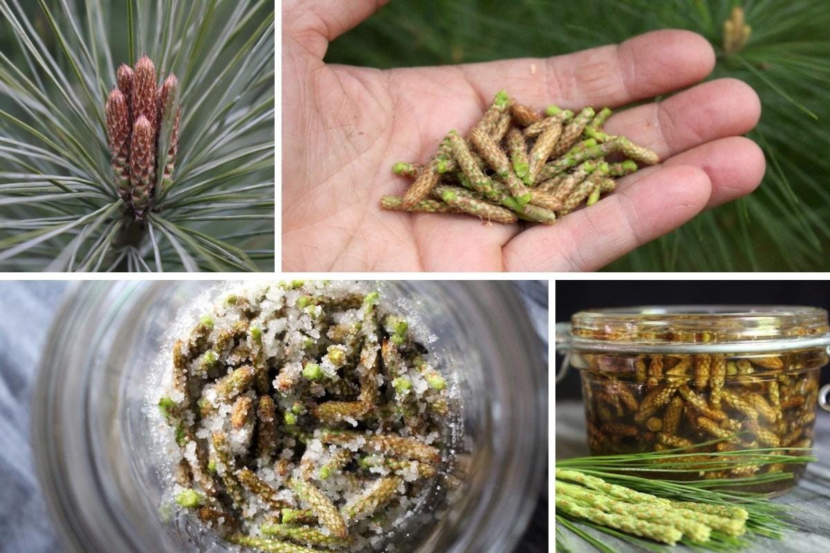 The “candles” are the fresh growing tips of pine trees, and they can be harvested when they’re 1 to 3 inches long in the spring. They’re full of flavor and nutrients, and while they can be eaten in a number of ways, I tend to toss them in a bit of sugar. This causes them to release liquid and resin, which combines with the sugar to create a delicious two ingredient syrup.