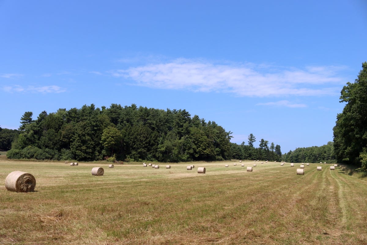 The road opened onto wide hayfields, where neat rows of golden bales dotted the green expanse. Under a brilliant summer sky, the scene was warm, open, and unmistakably Vermont.