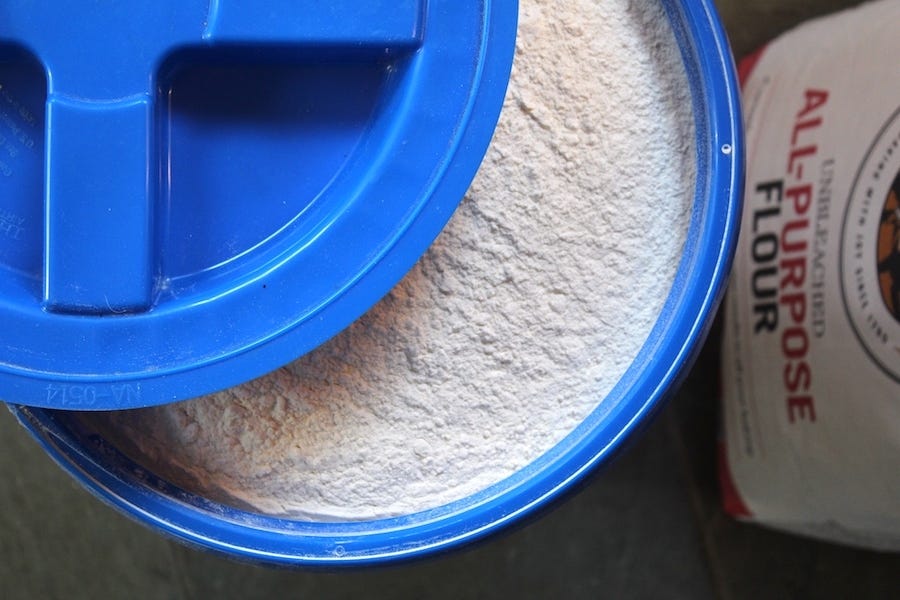 We keep a years worth of basic shelf stable food and supplies on hand at all times. From buckets of flour that we use to make bread, to spare parts for the tractor and the raw materials for making soap, herbal remedies, and countless other things.